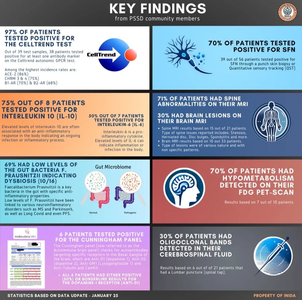 The Iatrogenic Neuroimmune Disease Association (INIDA) is a patient-led organization dedicated to documenting clinical findings and advancing scientific understanding of emerging drug-induced neuroimmune disorders. By gathering real-world clinical data and collaborating with clinicians and laboratories, INIDA has identified an interesting pattern of abnormalities across affected patients. The organization has found: